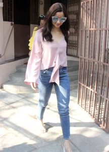 Alia Bhatt was spotted at a dubbing session in Bandra, Mumbai clad in chic casuals. For the occasion, Bhatt picked a pastel pink V-neck top featuring an interesting tie-detail on the bodice. She teamed it with a pair of blue crop jeans, clear heels from PVC and retro sunglasses rounded of her look.
