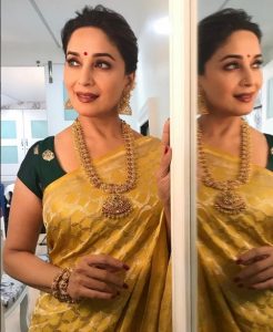 Madhuri Dixit donned ‘Lahari’ Varanasi silk brocade sari from the label’s Heer collection. Styled by celebrity stylist Ami Patel. It was teamed with a green blouse and the contrast worked rather well. The look was rounded out with a gorgeous neckpiece and earrings from the Heritage Collection of the label Anmol. Hair tied into a bun, a red bindi, beautifully done eyes and a rich brown lip shade completed the look.